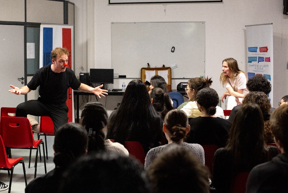 Le spectacle itinérant est une proposition thématique et interactive de 40 minutes environ, suivie d’un échange avec les apprentis-comédiens. Si le spectacle permet un premier contact avec le théâtre par une thématique précise, la discussion entend sensibiliser les élèves à la construction d’un spectacle, au métier de comédien et au rôle du spectateur.
